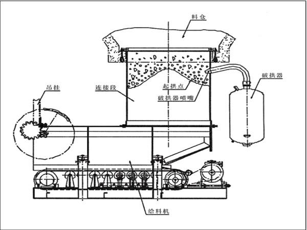 防止在給料機(jī)距離倉(cāng)口較高的時(shí)候,連接段內(nèi)的物料壓實(shí)粘結(jié)成拱或粘壁